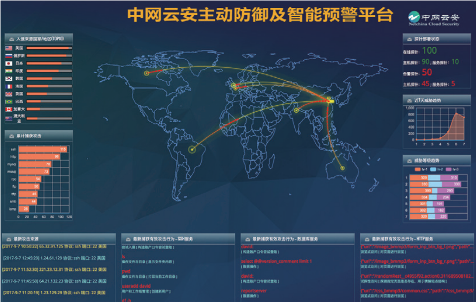 散播数百探针,感知并诱捕威胁,实现早期预警;分析入侵动机,定性威胁等级,同时针对外部入侵,内部间谍,恶意代码等均可有效阻断。